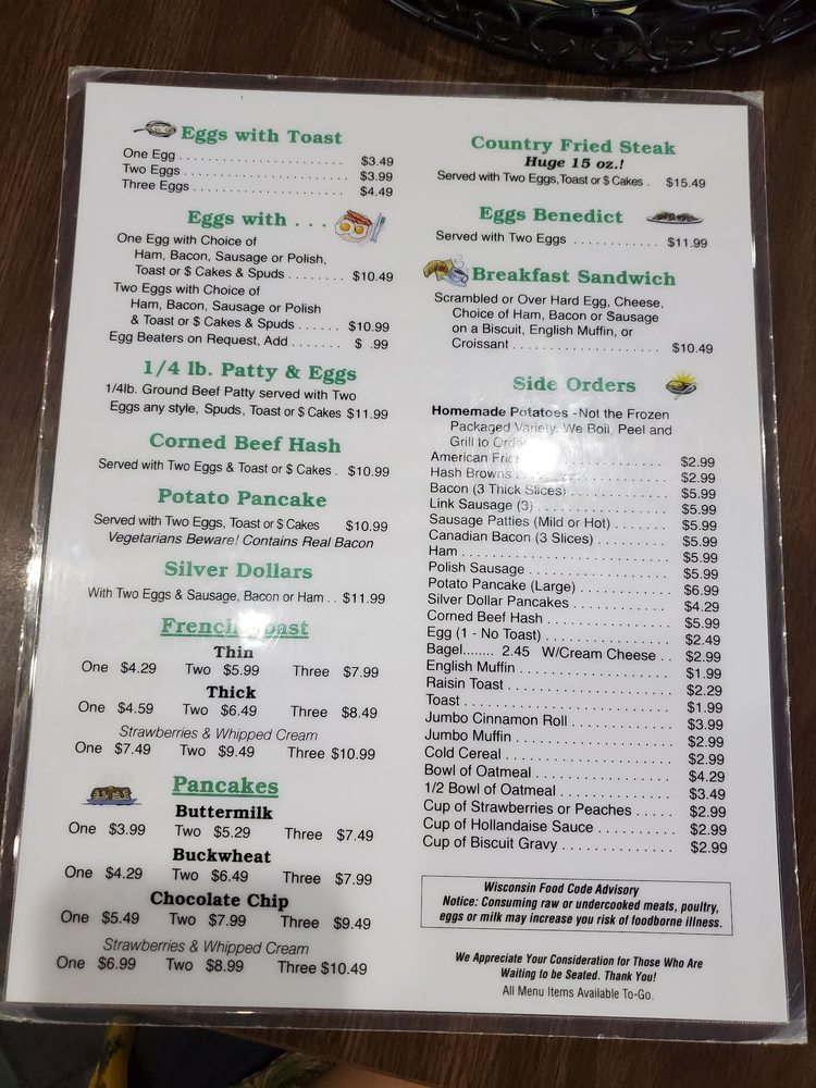 Served with choice of ham, bacon, sausage or Polish and toast or cakes and spuds. Egg beaters on request for an extra charge.